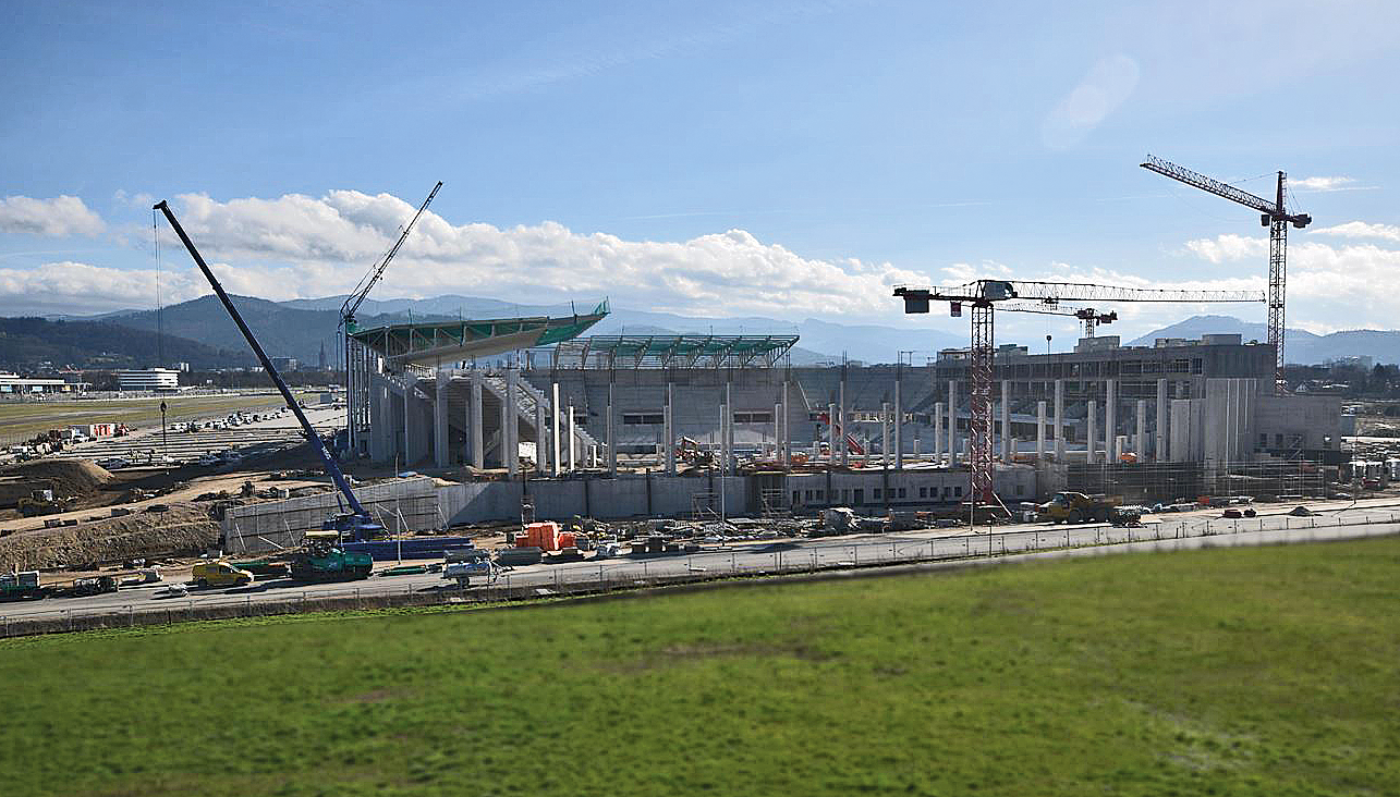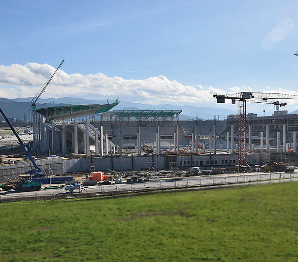 Auf den Stützen in den abgeschrägten Ecken des smaragdförmigen Stadionbaues, sowie an den Bindern der Haupttribüne werden Flächenloch-Gleitlager Typ Z eingesetzt. Diese können die zu erwarteten Verschiebungen mit einem niedrigen Reibwert ausgleichen, bei gleichzeitiger Aufnahme von Verdrehungen und zentrischer Ableitung der hohen Kräfte in die Stützstruktur.