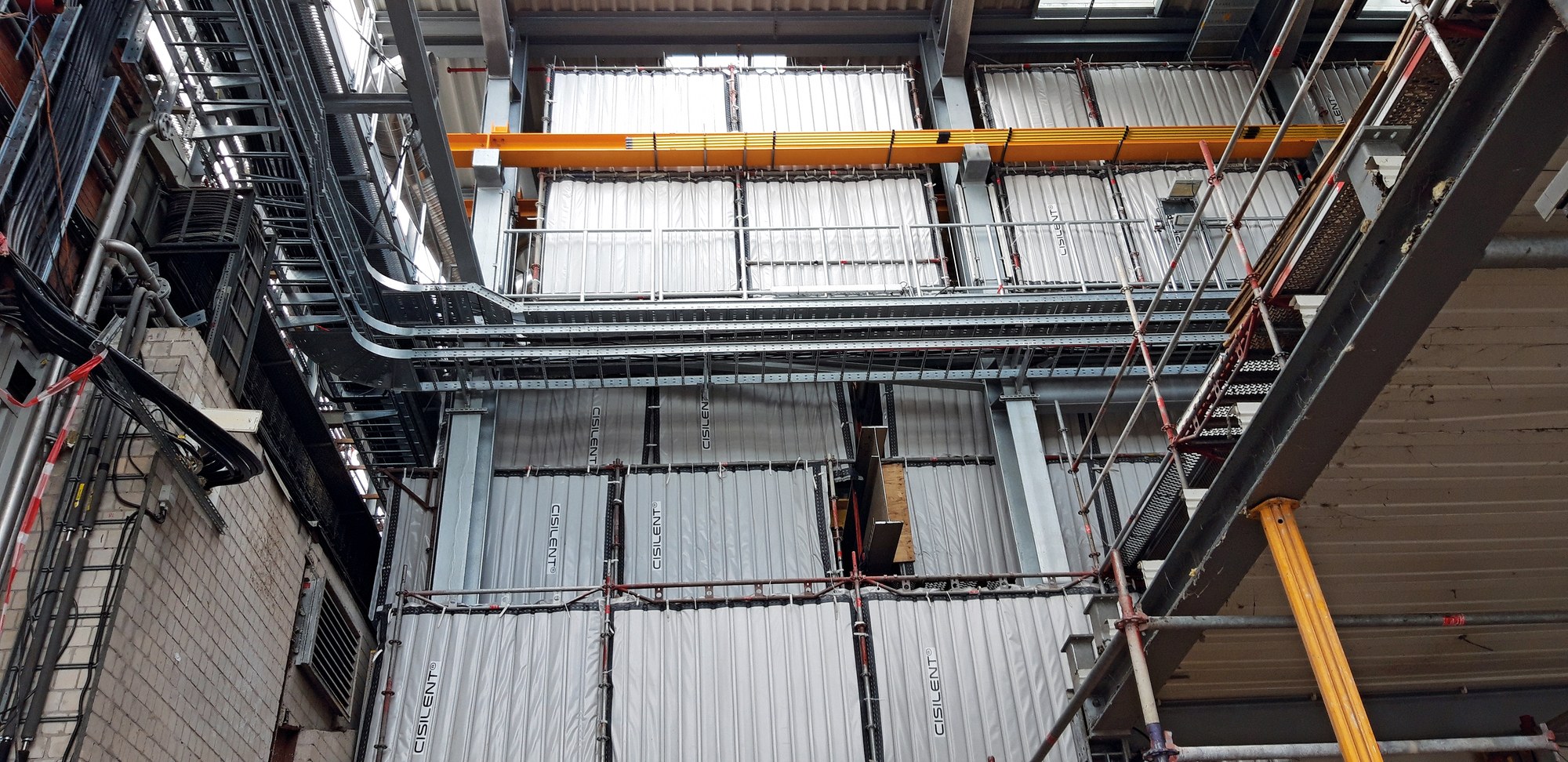 Das Mietsystem Cisilent Typ E wurde an den Grenzen der Bereiche eingesetzt, an denen der Lärm des Rückbaus die Arbeiter oder die Anwohner belästigen würde.Als Tragkonstruktionen dienten die neue Hallenstruktur oder Gerüste, die für den Rückbau gebraucht wurden.