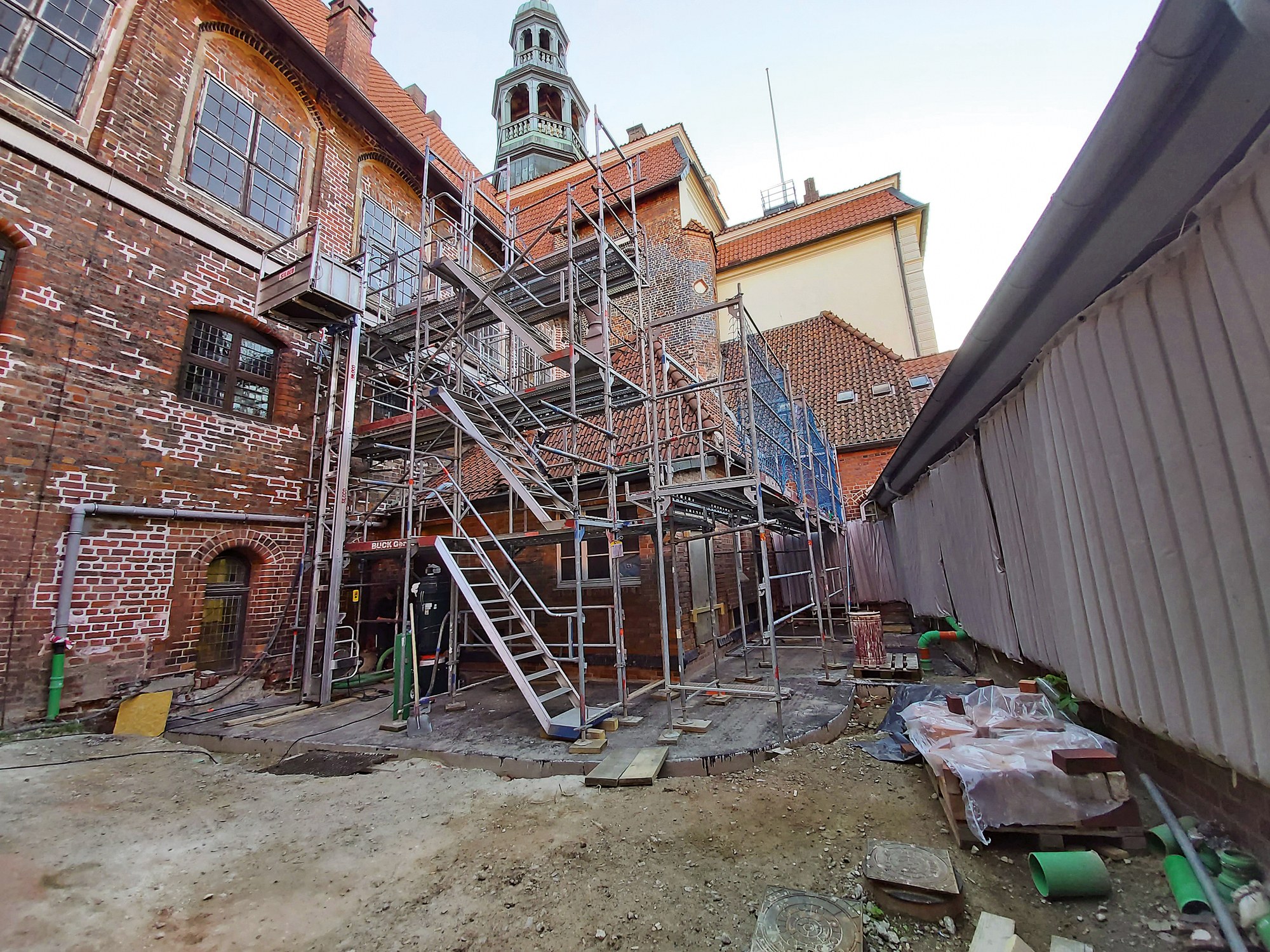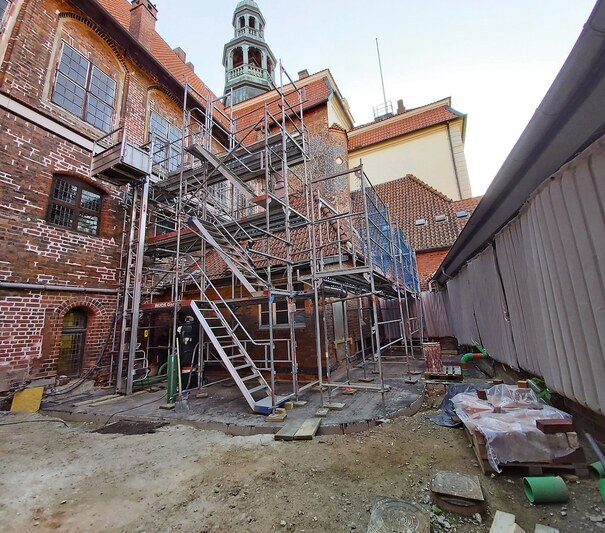 Ein Bereich des Lüneburger Rathauses wird gerade zur öffentlichen WC-Anlage umgebaut. Bei diesem Umbau sind Teile des Keller- und des Erdgeschosses betroffen.Im Erdgeschoss wird die WC-Anlage untergebracht und in zwei Kellerräumen die notwendige Technik. Im Rahmen von Voruntersuchungen wurde festgestellt, dass die Decke über dem Kellergeschoss, im zu sanierenden Bereich, abgängig ist. Daher musste diese abgebrochen werden. Die hierfür notwendigen Stemmarbeiten führten zu erhöhter Geräuschbelästigung für die anliegenden Arbeitsräume mit Publikumsverkehr der Touristeninformation Lüneburg. Die Außenfassaden der WC-Anlage und die zwei Außenwandbereiche der Touristeninformation befinden sich in einem gemeinsamen Hof.