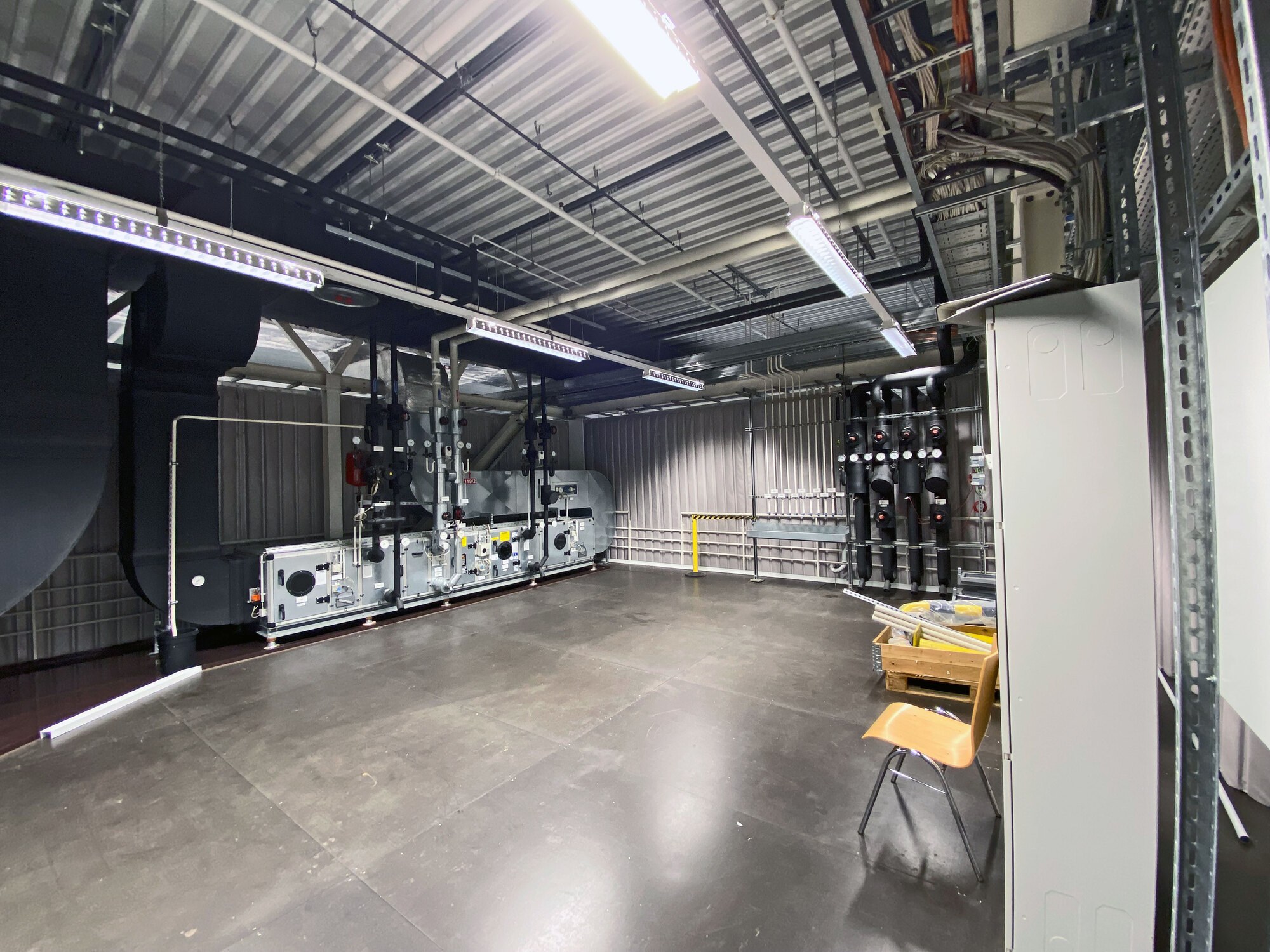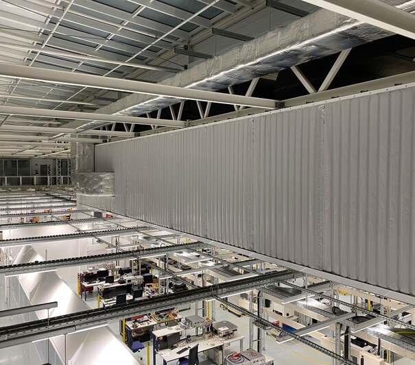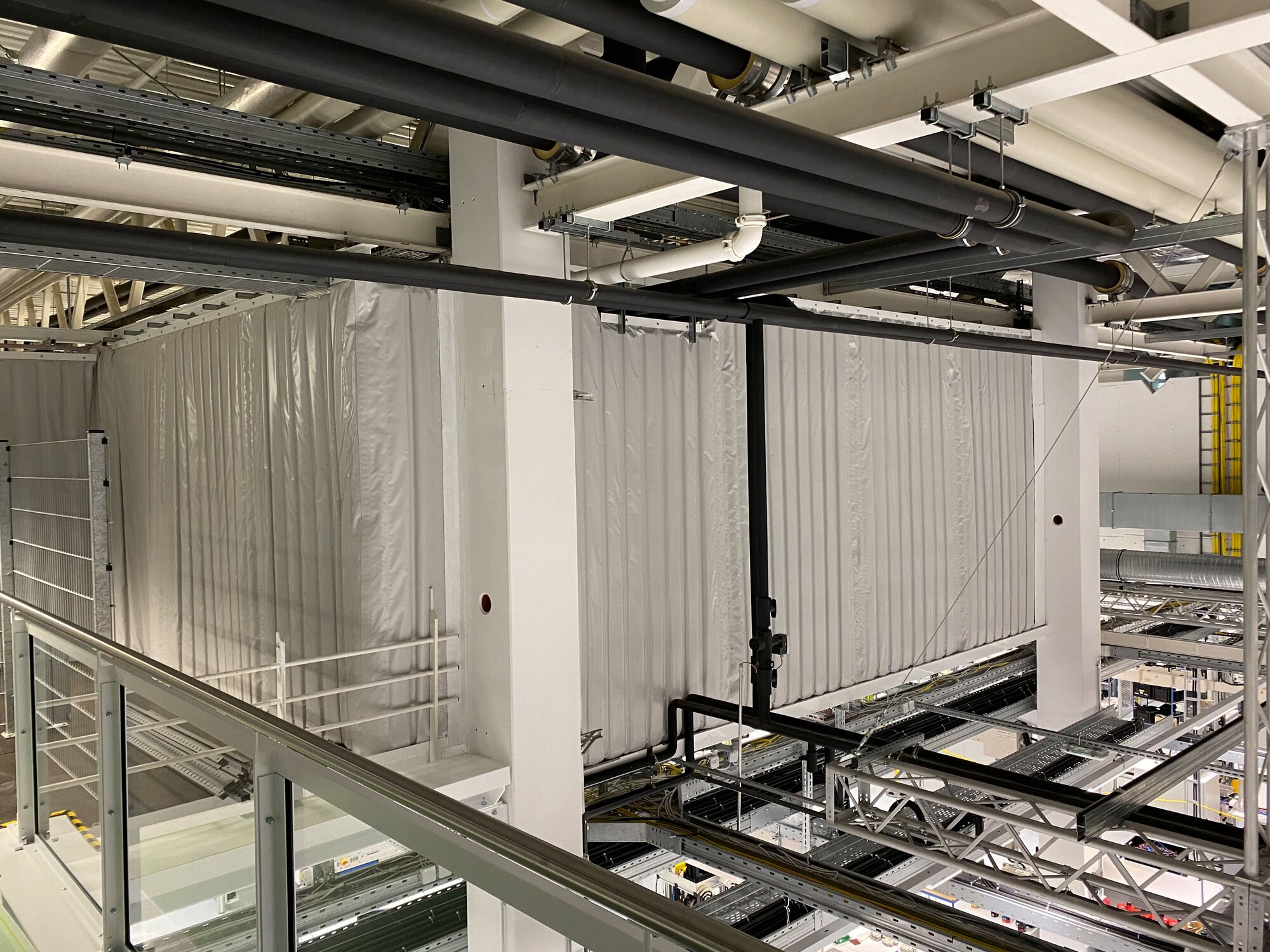 Die Technikbühne wurde an Ihren Rändern mit der Schalldämmung Cisilent Typ E eingehaust. In Zusammenarbeit mit der Firma Meier wurde festgelegt, wo feste Cisilent-Elemente angeordnet und wo bewegliche Cisilent-Elemente als Vorhangsystem notwendig waren.Die Rohrdurchführungen erhielten einen Schlitz zum Rand, der nach der Montage mit Klettbändern verschlossen wurde. Die Firma Meier plante und bereitete die Montage der beiden Bestandteile Cisilent und Tragkonstruktion vor. Die absorbierende Seite von Cisilent wurde den Maschinen zugewandt, um die Reflektion vom Hallendach zu brechen. Durch gute Abstimmung entstand unter schwierigen Randbedingungen eine funktionierende Einhausung, die nicht nur die Anforderungen an den Schallschutz erfüllt, sondern auch ästhetischen Anforderungen genüge tut. Einen entscheidenden Einfluss auf das Gesamtergebnis nimmt die professionelle Planung und Montage der Firma Meier Metallbau & Konstruktionstechnik.