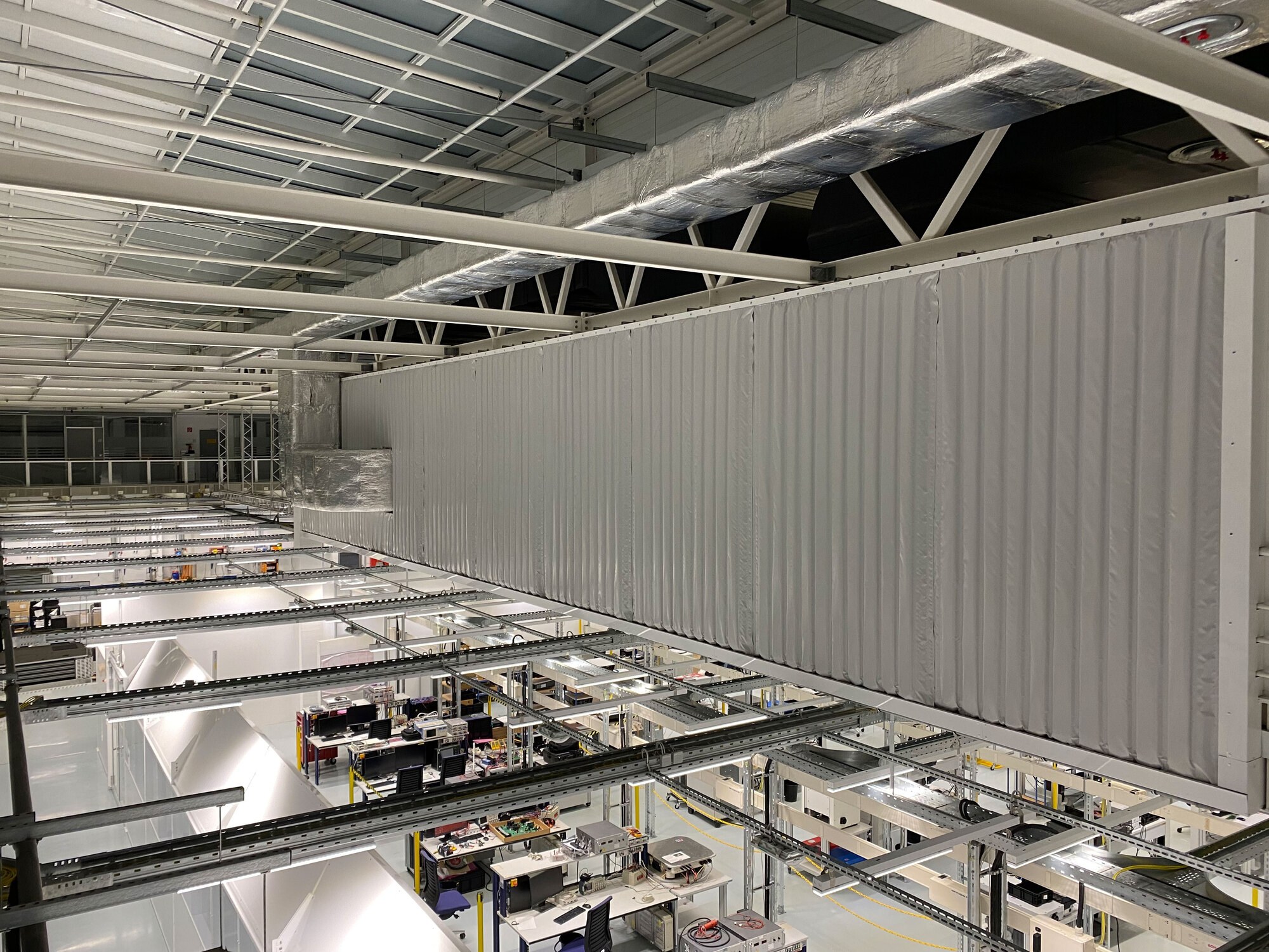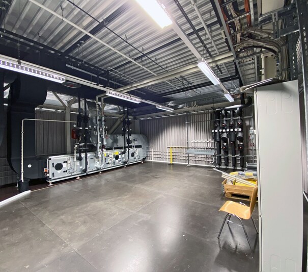 Die Kassler schuh-Architekten planten Ende 2020 die schalltechnische Entkopplung einer Technikbühne, die von der Stahlkonstruktion der Halle abgehängt ist. Der Lärm der Aggregate beeinträchtige die Prüfarbeiten, die unter der Bühne durchgeführt werden. Die Lüftungsanlage ist dicht am Rand der Bühne aufgestellt und eine Montage von unten ist aufgrund der dort aufgestellten Prüfeinrichtung nicht möglich. Die schuh-Architekten suchten eine Lösung, die bei gegebenen Randbedingungen eine Pegelreduktion von 18 dB über ein breitbandiges Spektrum bietet. Den Auftrag für die Planung und Ausführung der Tragkonstruktion erhielt die Firma Meier Metallbau & Konstruktionstechnik aus Heiligenstadt.Die Lösung