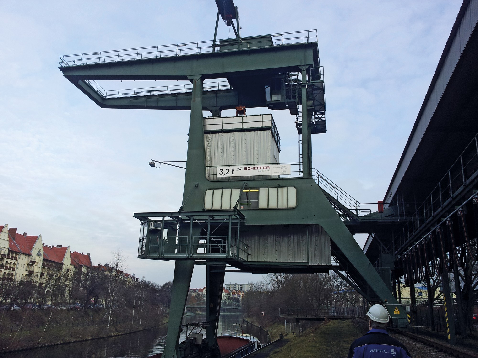 Das Heizkraftwerk in Berlin-Westend wird mit Kohle befeuert, die über den angrenzenden Berlin - Spandauer Schiffahrtskanal per Frachtschiffen angeliefert wird.Beim Ausladen über einen Kran und der anschließenden Beförderung durch einen Falltrichter sowie über Laufbänder entstanden hohe Schallpegel, die die Patienten und das Personal des Klinikums der Charité störten. Eine Messung ergab, dass eine Lärmminderung am Uferkran vorzunehmen sei. Dabei kam nur eine direkte Einhausung der Lärmquellen am Uferkran in Frage.
